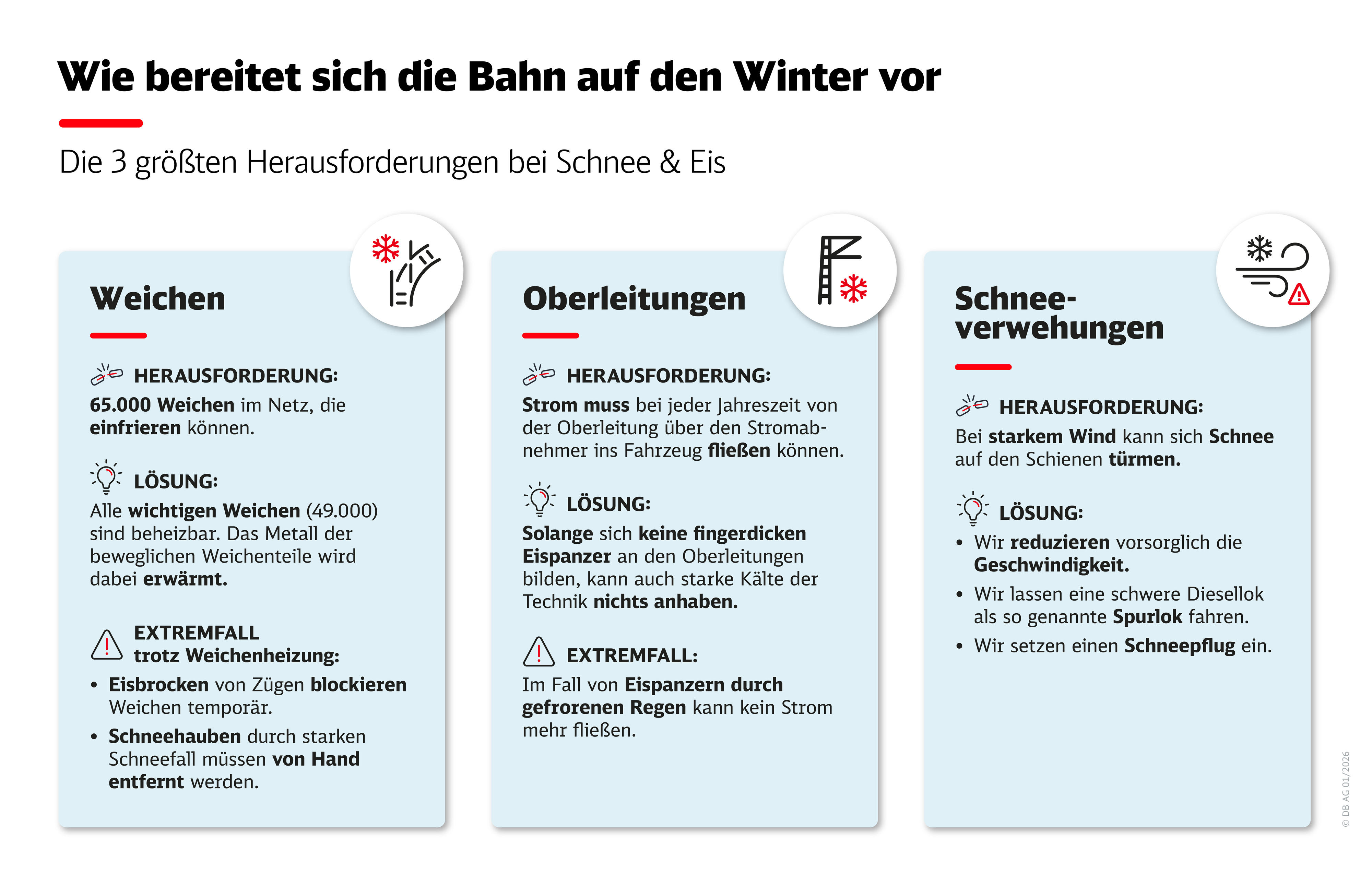 Auch in diesem Jahr haben wir unsere Wintervorbereitungen nochmal intensiviert. Mehr als 14.200 Mitarbeitende bundesweit sorgen dafür, Bahnsteige und Gleise schneller von Schnee und Eis zu befreien. An strategisch wichtigen Punkten im Schienennetz stehen Räumfahrzeuge und schwere Loks bereit, viele Weichen sind inzwischen mit Weichenheizungen und sogenannten Antriebsabdeckungen besser vor Schnee und Eis geschützt. Dennoch sind wir, so wie auch andere Verkehrsträger, auch bei bestmöglicher Vorbereitung nicht gegen alle Witterungen gefeit.