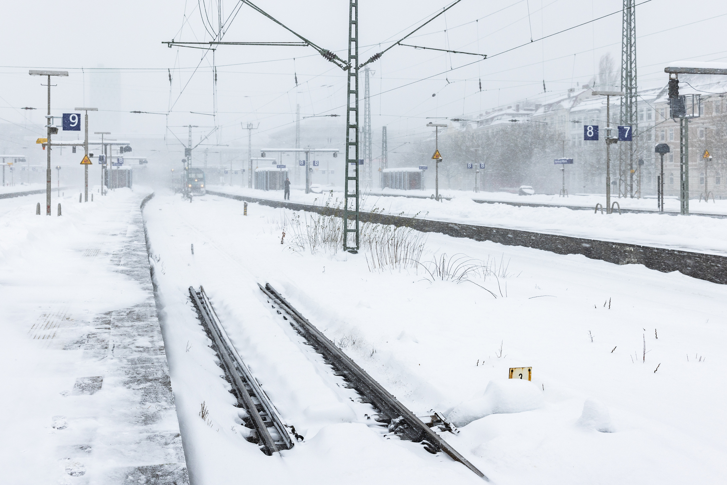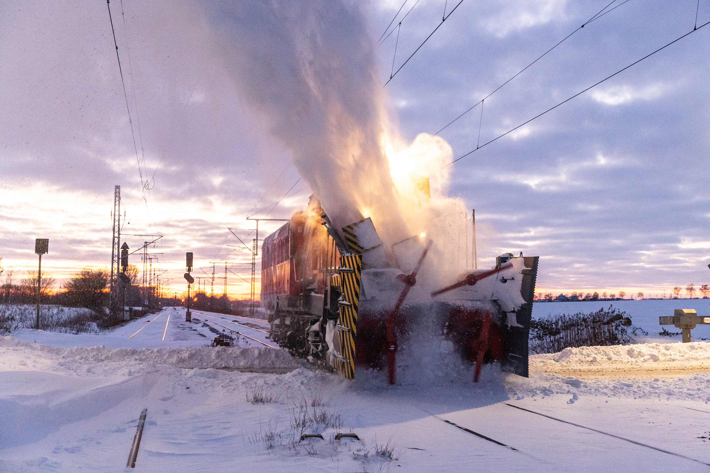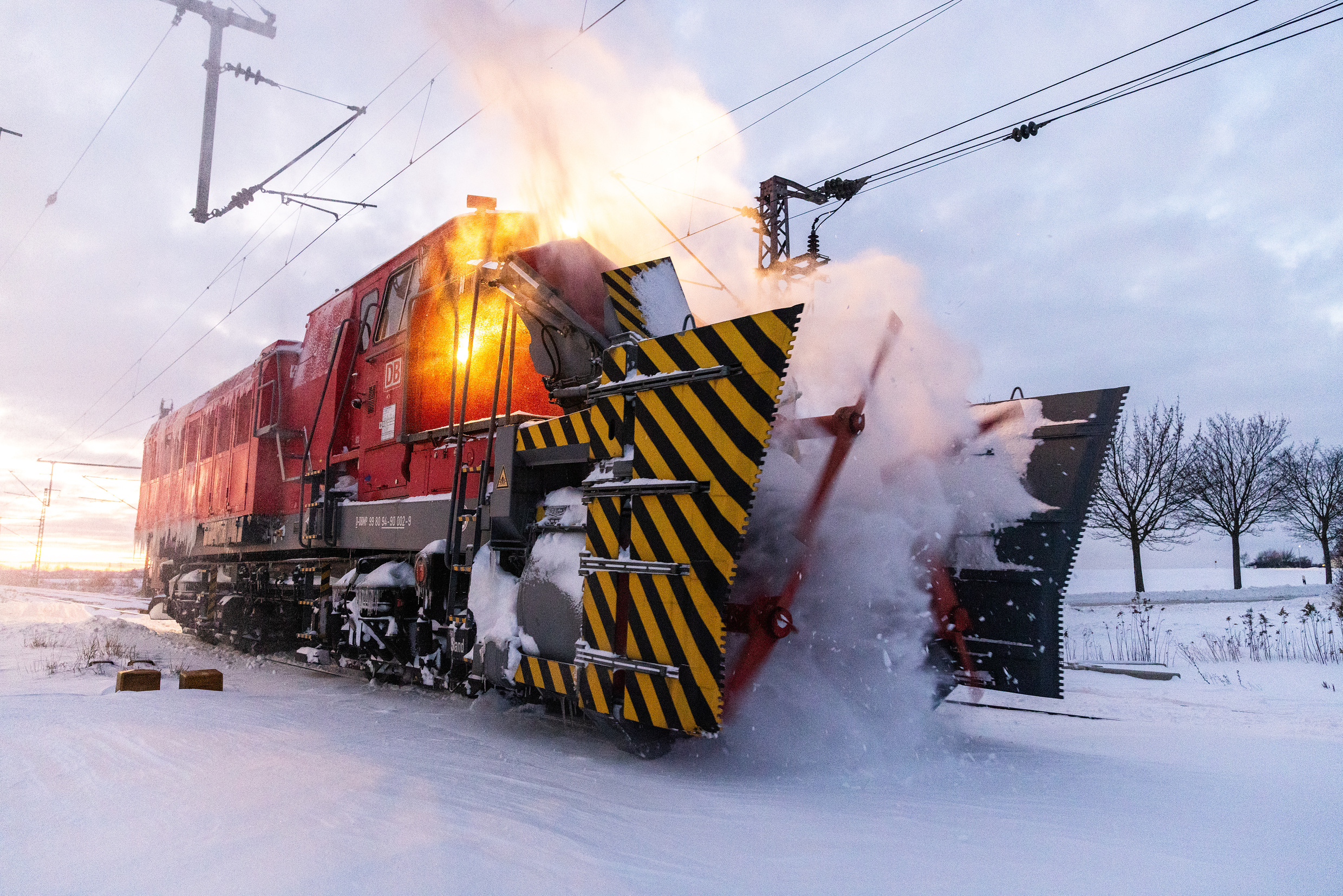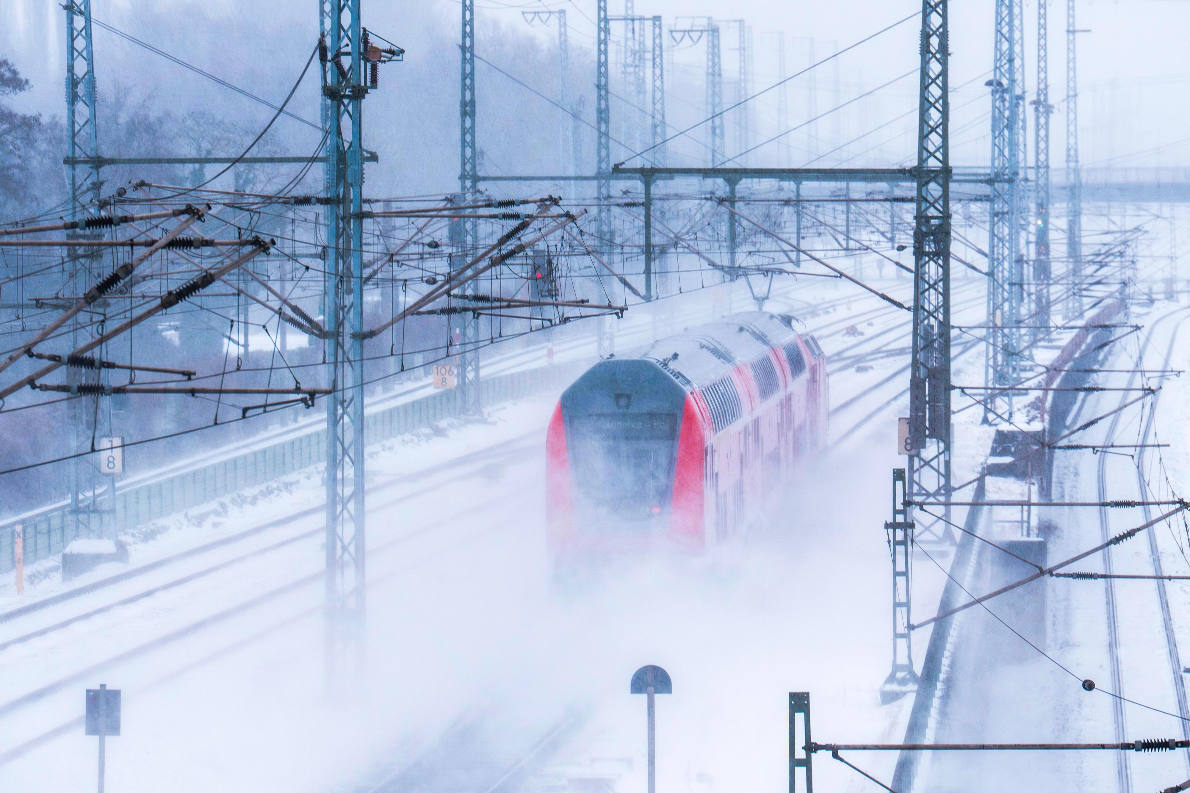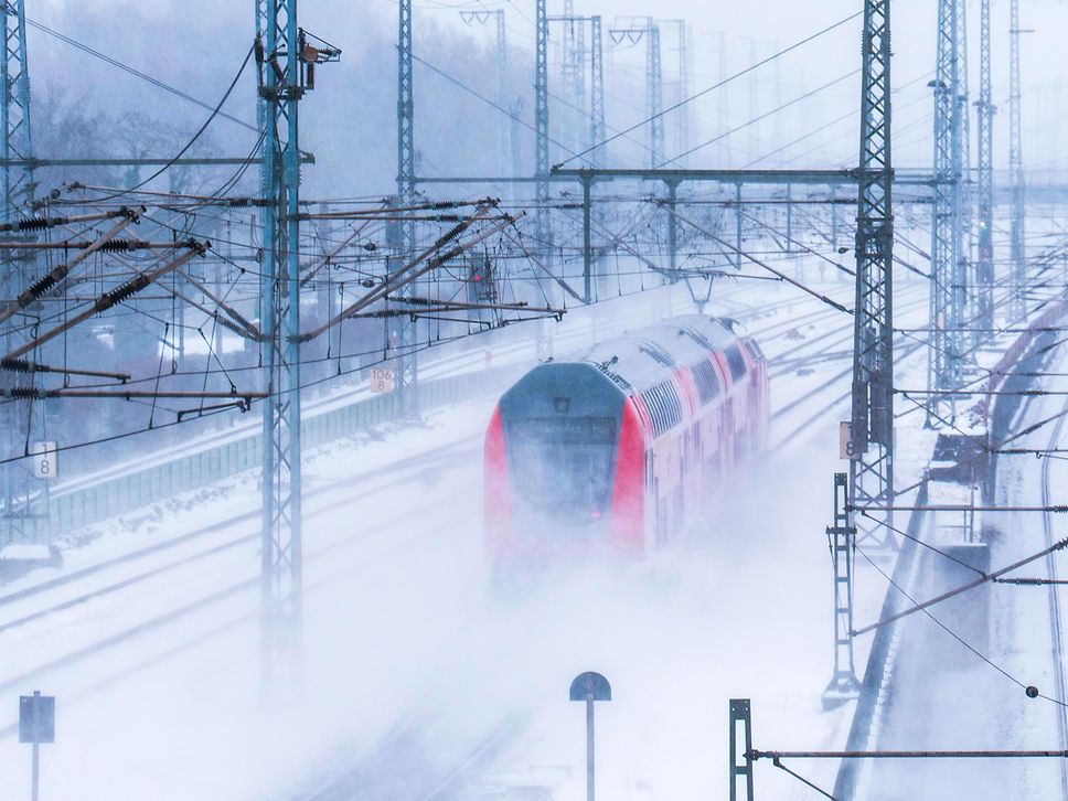 Anders als im Straßenverkehr sind Züge auch bei Eis und Schnee sicher unterwegs. Schwierig wird es nur, wenn es bei starkem Wind zu Verwehungen kommt und der Schnee sich auf den Schienen auftürmt. Dann können wir folgendes tun: