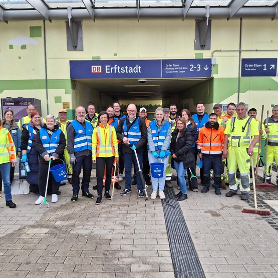Zusätzliche Reinigung an rund 200 Stationen in NRW Heute Auftakt im Bahnhof Erftstadt • Freiwillige Helfende im Einsatz • Reisende und Bahnhofsbesucher:innen fühlen sich wohler, wenn es sauber ist • DB investiert 2026 rund 50 Millionen Euro mehr für Sicherheit und Sauberkeit an den Bahnhöfen