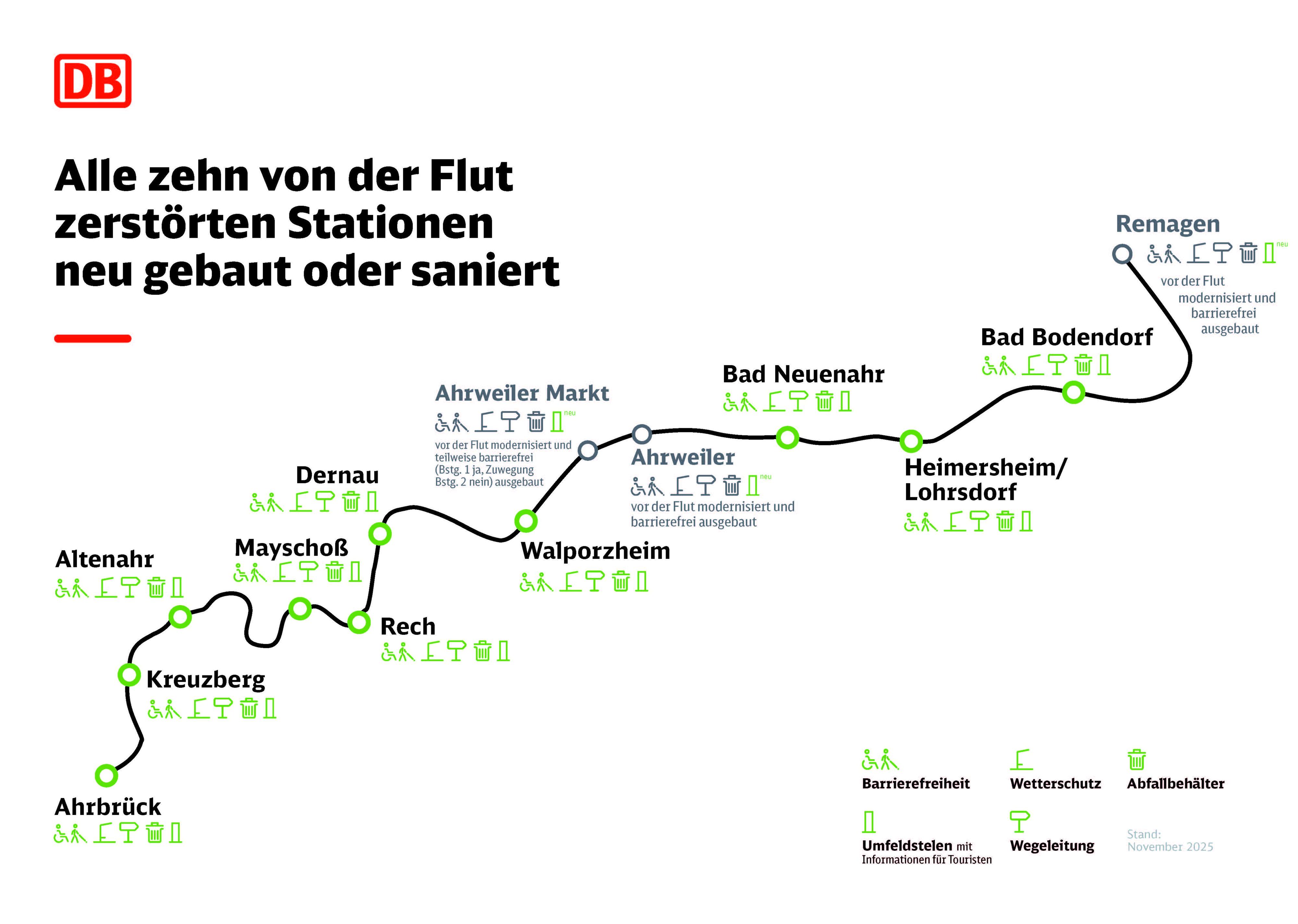 In vier Wochen ist es so weit: Mitte Dezember können wieder Züge über die neue Ahrtalbahn fahren. Damit die Reisenden dann auch an modernen Stationen ein- und aussteigen können, hat die Deutsche Bahn (DB InfraGO) neben dem Wiederaufbau und der Elektrifizierung der Strecke alle zehn von der Flut zerstörten Stationen neu gebaut oder umfangreich saniert. Zudem sind die insgesamt 13 Stationen entlang der Bahnlinie von Remagen bis Ahrbrück Mitte Dezember bis auf Bahnsteig 2 in Ahrweiler-Markt vollständig barrierefrei. Dank weiterer Verbesserungen wie Wetterschutzhäusern, moderner dynamischer Schriftanzeiger und neuer Wegeleitung profitieren die Kundinnen und Kunden ab Fahrplanwechsel insgesamt von höherem Komfort und mehr Aufenthaltsqualität. Der Zugang zur klimafreundlichen Schiene wird so an der Ahrtalbahn noch einfacher und besser möglich.
