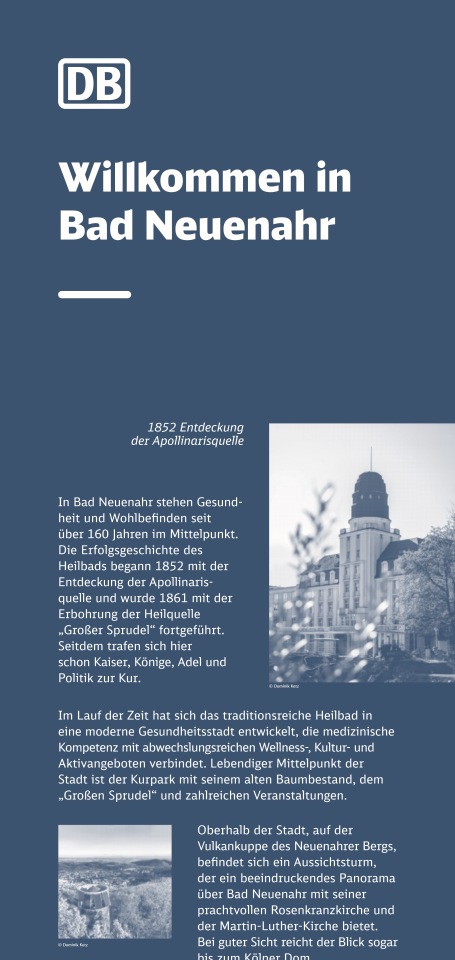 Gemeinsam mit dem Zweckverband Schienenpersonennahverkehr Rheinland-Pfalz Nord (SPNV Nord) und dem Ahrtal-Tourismus Bad Neuenahr-Ahrweiler e.V. hat die DB außerdem ein neues Konzept zur Förderung der regionalen Identität des Ahrtals an allen 13 Stationen entlang der Strecke umgesetzt. An eigens für die jeweiligen Orte erarbeiteten Stelen finden Tourist:innen und Interessierte Wissenswertes über die Geschichte und Hinweise auf attraktive Ausflugziele. So erfahren die Reisenden und Besucher:innen zum Beispiel in Bad Neuenahr, wie es zur Entdeckung der Apollinarisquelle im Jahr 1852 kam. Am neuen Bahnhof in Heimersheim-Lohrsdorf können sie lesen, dass die Bleiglasfenster der Kirche zu den ältesten Glasmalereien Deutschlands zählen.