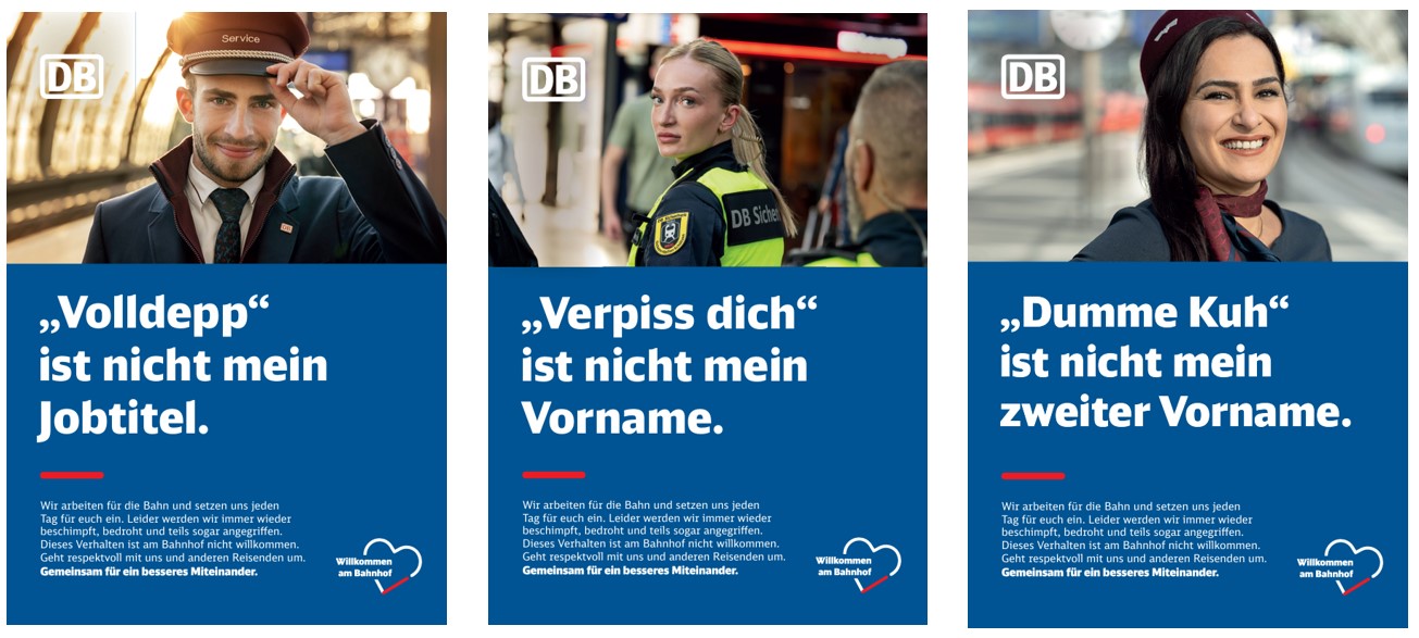 Täglich frequentieren rund 20 Millionen Reisende und Besucher:innen die 5.700 Bahnhöfe der DB. Wir wollen mit der Kampagne das Bewusstsein aller Menschen am Bahnhof für einen respektvollen Umgang mit Mitarbeitenden sowie untereinander erhöhen und für respektloses Verhalten sensibilisieren. Deshalb haben die Personenbahnhöfe der DB erstmals eine Respektkampagne gestartet. Sie soll dort Aufmerksamkeit für den Umgang mit DB Mitarbeitenden erzeugen, wo Reisende und Bahnhofsbesucher:innen Respekt manchmal vermissen lassen: am Bahnhof.Die Kampagne in den nördlichen Bundesländern zeigt anhand verschiedener Plakatmotive DB Mitarbeitende und stellt ihnen exemplarisch eine Beleidigung gegenüber, mit der sie sich im Arbeitsalltag konfrontiert sehen. „,Verpiss dich!' ist nicht mein Vorname“, heißt es zum Beispiel auf einem Motiv mit einer Mitarbeiterin der DB-Sicherheit. „Wir arbeiten für die Bahn und setzen uns jeden Tag für euch ein. Leider werden wir immer wieder beschimpft, bedroht und teils sogar angegriffen. Dieses Verhalten ist am Bahnhof nicht willkommen. Geht respektvoll mit uns und anderen Reisenden um. Gemeinsam für ein besseres Miteinander“ heißt es auf den Plakaten weiter.