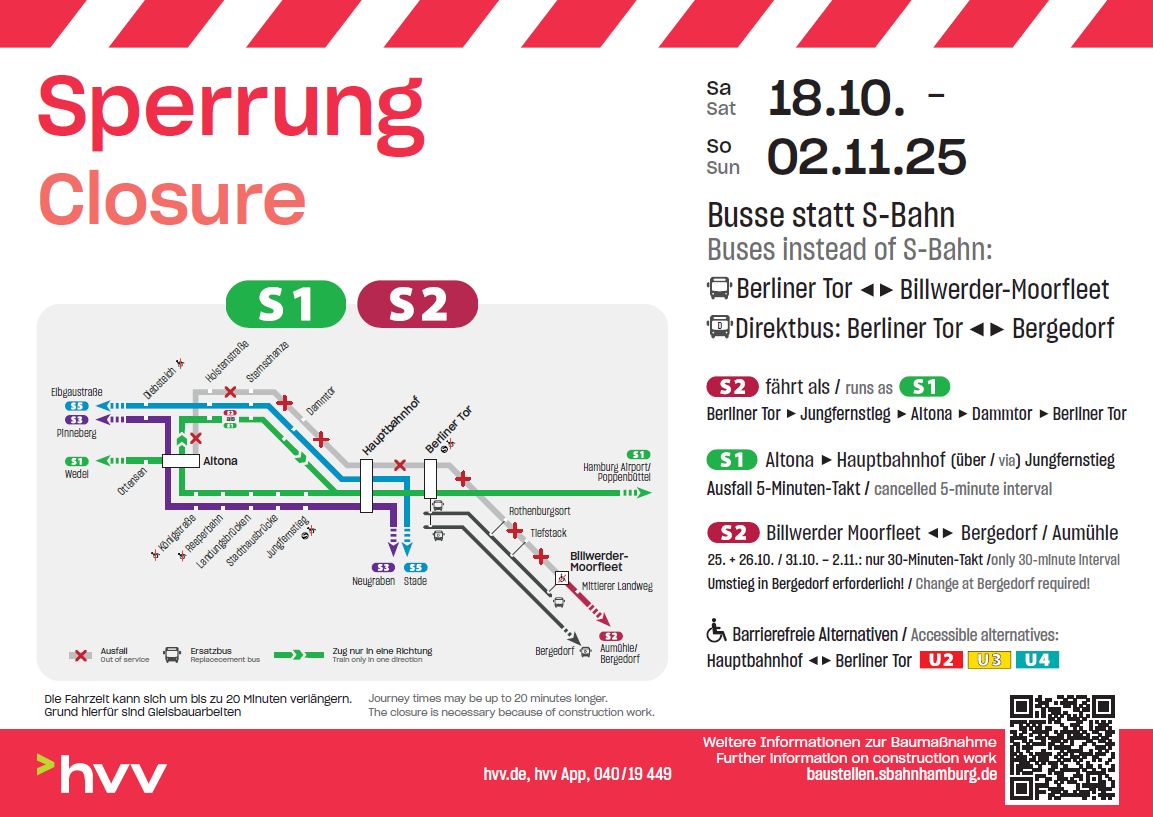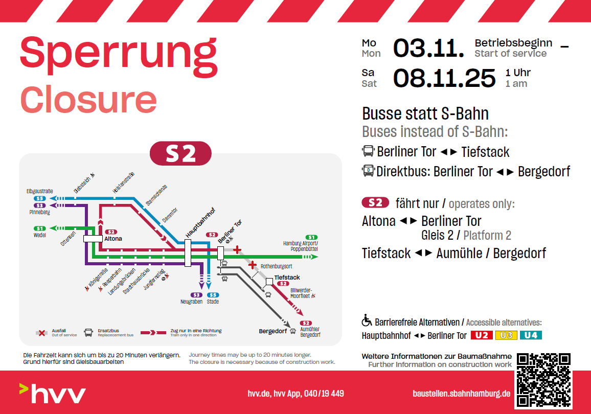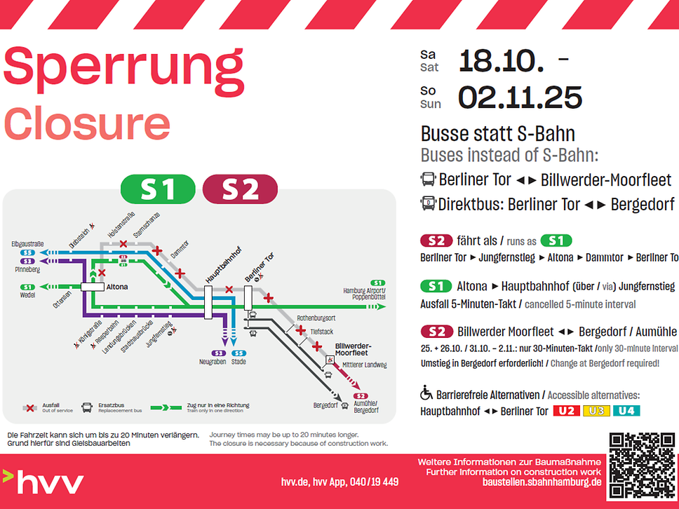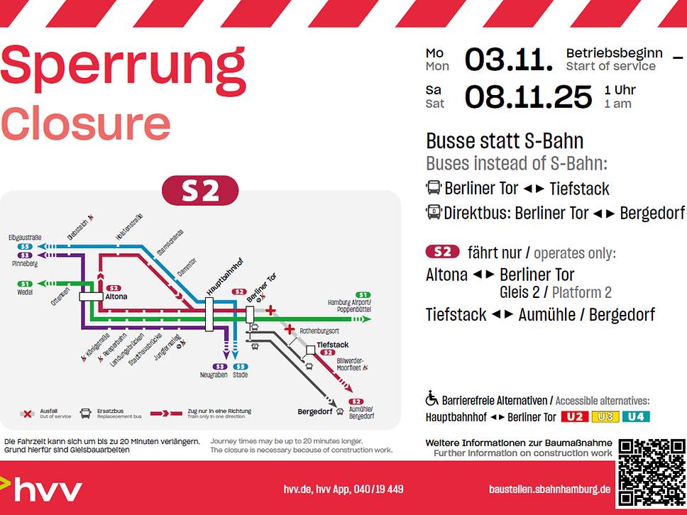 Von Samstag, 18. Oktober, bis einschließlich Sonntag, 2. November, sind die S-Bahn-Gleise auf der Linie S2 zwischen Berliner Tor und Billwerder-Moorfleet für den S-Bahnverkehr gesperrt. Dafür fahren zwischen Bergedorf und Berliner Tor in diesem Zeitraum Direktbusse. Sie fahren im Fünf-Minuten-Takt ohne Zwischenhalt durch.