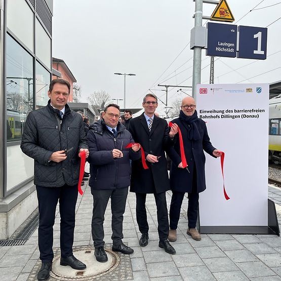 v.l.n.r Frank Kunz, Oberbürgermeister der Stadt Dillingen, Ulrich Lange, Parlamentarischer Staatssekretär beim Bundesminister für Verkehr, Alexander Bonfig, Abteilungsleiter Schienen- und Luftverkehr im Bayerischen Staatsministerium für Wohnen, Bau und Verkehr, Heiko Büttner, DB-Konzernbevollmächtigter für den Freistaat Bayern