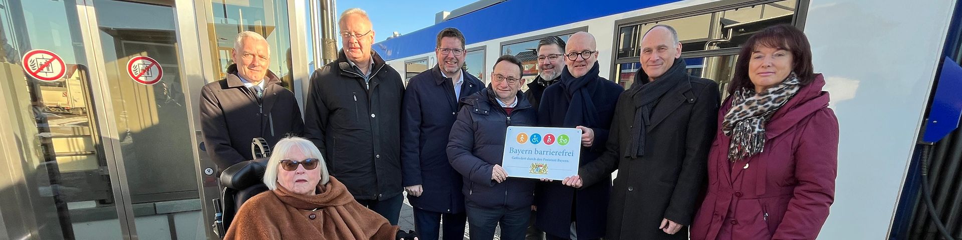Eröffneten symbolischen den barrierefrei ausgebauten Bahnhof Marktoberdorf (von hinten links.): Dr. Thomas Gruber (Amtschef des Bayerischen Staatsministeriums für Wohnen, Bau und Verkehr), Bernhard Pohl (Mitglied des Bayerischen Landtags), Stephan Stracke (Mitglied des Bundestages), Ulrich Lange (Parlamentarischer Staatssekretär beim Bundesminister für Verkehr), Andreas Kaufmann (Mitglied des Bayerischen Landtags), Heiko Büttner (DB-Konzernbevollmächtigter für den Freistaat Bayern), Dr. Wolfgang Hell (Erster Bürgermeister der Stadt Marktoberdorf), Maria Rita Zinnecker (Landrätin Ostallgäu) sowie Waltraud Joa (vorne, Behindertenbeauftragte der Stadt Marktoberdorf).