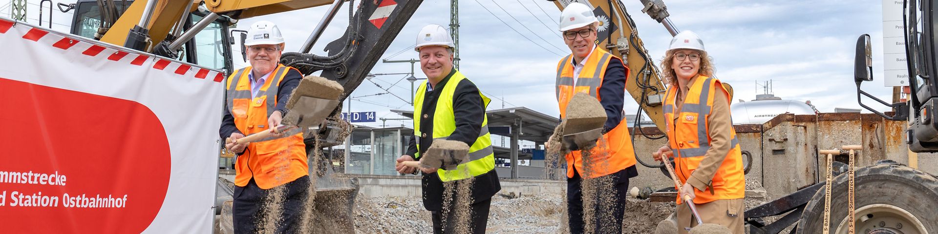 Mit einem symbolischen Spatenstich haben heute Bayerns Verkehrsminister Christian Bernreiter, Frank Abel (Bereichsleiter Europe, Hochtief) und Heike Junge-Latz (Vorständin Anlagen- und Instandhaltungsmanagement, DB InfraGO) die Arbeiten für die neue Station Ostbahnhof und die unterirdischen Rohbauten im Ostabschnitt der 2. Stammstrecke gestartet. Damit befindet sich das Projekt nun im gesamten Innenstadtbereich – von Laim bis Leuchtenbergring – in der Bauphase.