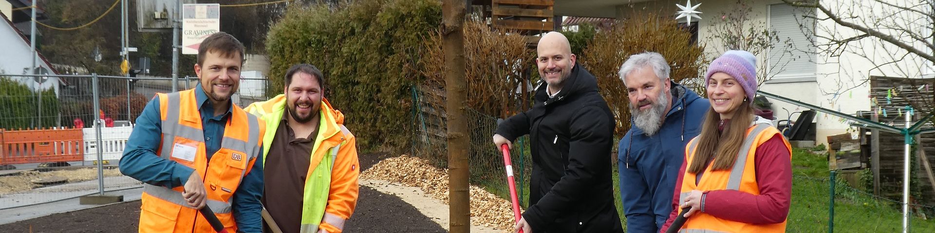 Die Arbeiten der Deutschen Bahn (DB) zur Neugestaltung der Grünanlage „Kusterdinger Straße“ in Wannweil schreiten voran: Nach Abschluss der Erd- und Pflasterarbeiten pflanzten heute Dr. Christian Majer, Bürgermeister der Gemeinde Wannweil, Carsten Göhner, Wannweils Ortsbaumeister, und Karl Pietzsch, Projektleiter bei der DB, gemeinsam den ersten Baum. Während der Erneuerung der benachbarten Eisenbahnbrücke nutzte die DB die gemeindeeigene Grünfläche als Baustellenfläche. Insgesamt investiert die DB rund 334.000 Euro in die neue Grünanlage.
