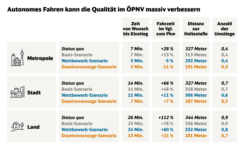 Wären rund eine Million autonome Shuttles und Busse unterwegs, lägen die durchschnittlichen Wartezeiten der Fahrgäste bis zum Einstieg bei 5 Minuten in Metropolen und bei 13 Minuten im ländlichen Raum. Letzteres wäre 50 Prozent kürzer als aktuell. Die Reisezeiten entsprächen nahezu denen des Pkw und wären in Metropolen teilweise sogar kürzer.
